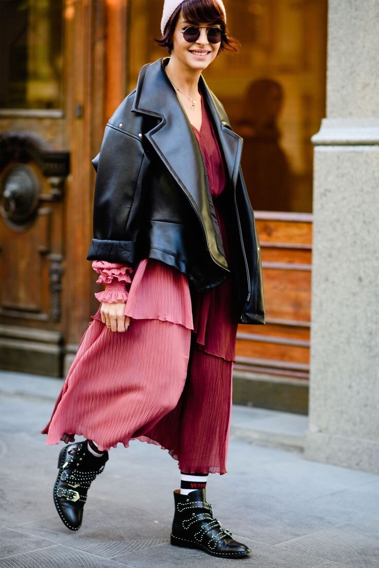 Юбка в стиле гранж должна быть длины макси. Она совсем не про сексуальность, а скорее про сдержанность. Девушки, поддерживающие стиль гранж, они хотят скорее показать выразить протест, а не привлечь внимание. Поэтому длинные юбки мы советуем носить с ботильоными на устойчивом каблуке и майками с обрезанными рукавами.