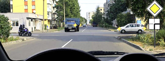 На этом перекрестке неравнозначных дорог (знаки 2.1 «Главная дорога» и 8.13 «Направление главной дороги») Вы должны уступить дорогу только приближающемуся справа легковому автомобилю, который так же, как и Вы, находится на главной дороге, поэтому разъезжаться с ним следует по правилам проезда перекрестков равнозначных дорог (п. 13.10) и (п. 13.11). Мотоцикл и грузовой автомобиль уступают дорогу Вам, так как находятся на второстепенных дорогах (п. 13.9).