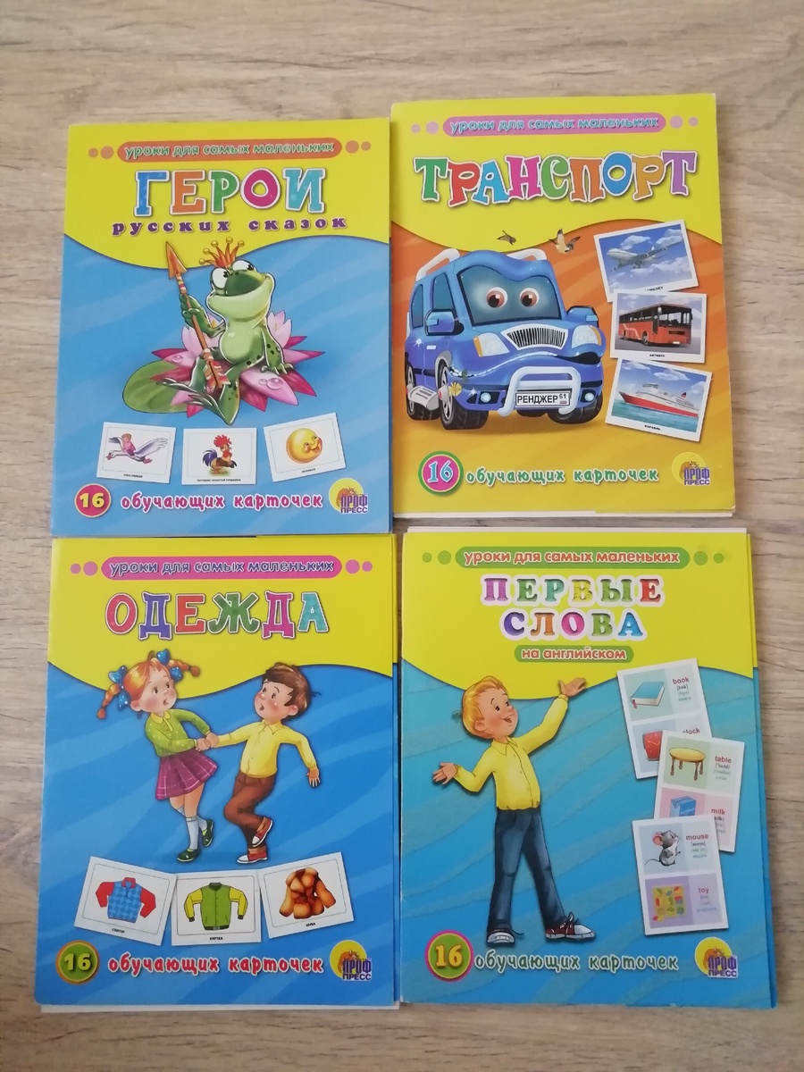 Приобрела простые наборы карточек для своего сына, когда ему было около года. Показывала карточки каждый день. Сын пытался повторять за мной слова. Набор карточек "транспорт" самый любимый у сына. Даже сейчас по прошествии времени мой сын разбирается в технике, знает все модели машин, мотоциклов ( наш папа собирает модельки мотоциклов). Когда выходили на улицу показывала на скорою помощь, автобус, мотоцикл и т. д. А когда приходили домой, то сын показывал карточки с той техникой которую видел на улице. В каждом наборе 16 обучающих карточек из картона. Картон достаточно мягкий. Под картинкой имеется соответствующая подпись. Иллюстрации яркие, реалистичные. Показывая геров из сказок, с папой читали или сами придумывали рассказы для сына. Что дает карточка. Речь-сначала говоришь ребенку слово, а он должен повторить. Память и внимание-ребенок запоминает все детали и должен найти карточку, которую попросили.