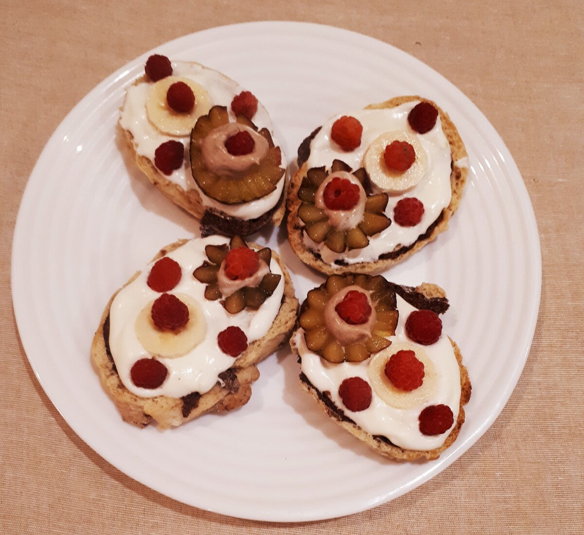 Готовые пирожные разрезала на две половинки, намазала взбитыми сливками с сахаром и с ванилином. Далее на один край положила кружочек банана, а на другой цветок из сливы, а вместо сердцевины выложила мороженое с шоколадом, а по краям установила малину. Вот такие получились пирожные, интересные и вкусные.