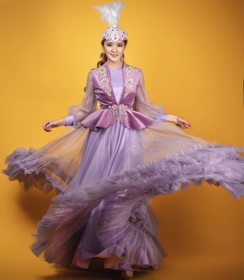 Исконный казахский свадебный костюм вовсе не обязан быть белым. Взгляните, как удачно здесь сочетаются оттенки сиреневого: более холодный и более тёплый. Воздушное плиссированное платье дополняет мягкий вышитый камзол и национальный головной убор — саукеле.