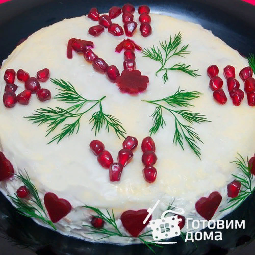 ИНГРЕДИЕНТЫ картофель3-4 шт копченая курица или кальмары 200 г маринованные огурцы 2 шт яйца 3 шт яблоко (по желанию)1 шт сыр150-200 г чеснок (по вкусу)1-2 зубчика майонез зерна граната, свекла и зелень (для украшения) соль свежемолотый перец Пошаговый рецепт с фото Картофель вымыть, отварить в мундире, очистить и натереть на крупной терке.