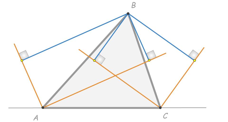 См. также задание. Оранжевые лучи — биссектрисы внутренних и внешних углов ∠A и ∠C треугольника ABC. Синие отрезки — перпендикуляры к этим биссектрисам. а) Докажите, что желтые точки лежат на одной прямой.