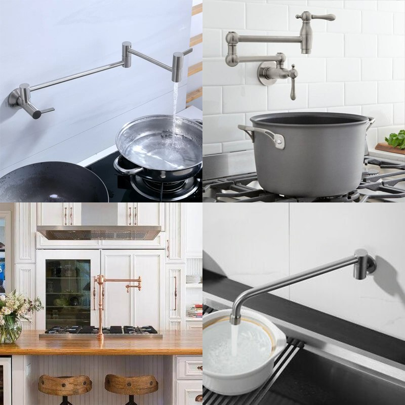 Особенность такого крана заключается в том, что он имеет шарнирное соединение, которое позволяет его поворачивать куда нужно. Можно наполнять емкости, как на самой плите, так и рядом с ней. С помощью него очень удобно наполнять кастрюли и чайники.
