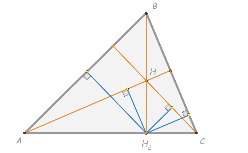 См. также задание. Точка H — ортоцентр △ABC. (△ABC общего вида, но можно ограничиться «остроугольным» случаем, как на рисунке.) Синие отрезки — перпендикуляры, опущенные из точки H₂ на прямые AB, AH, CH и BC. а) Докажите, что желтые точки лежат на одной прямой.
