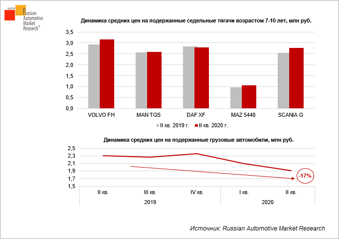 Агентство Russian Automotive Market Research проанализировало цены с электронных площадок на грузовые автомобили с пробегом и подготовило отчет по динамике средних цен за II квартал 2019 г. – II квартал 2020 г.