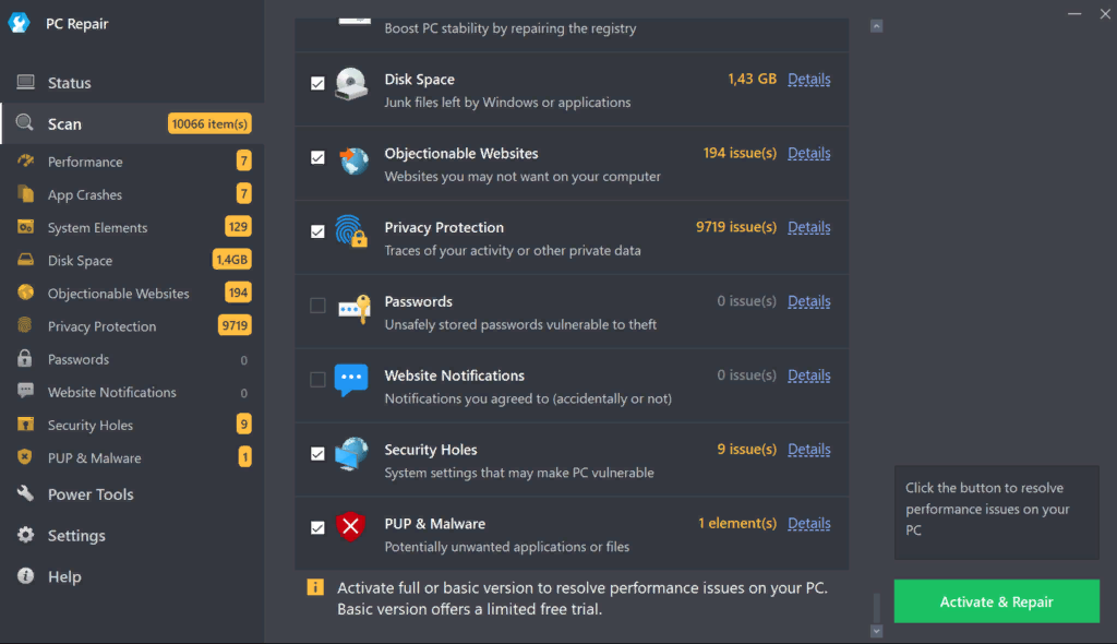 Ремонт не занял много времени, и я наблюдал за ходом работы инструмента по очистке и оптимизации моего компьютера. Я заметил, что он пропустил некоторые параметры, такие как «Уведомления веб-сайта» и «Вредоносное ПО».