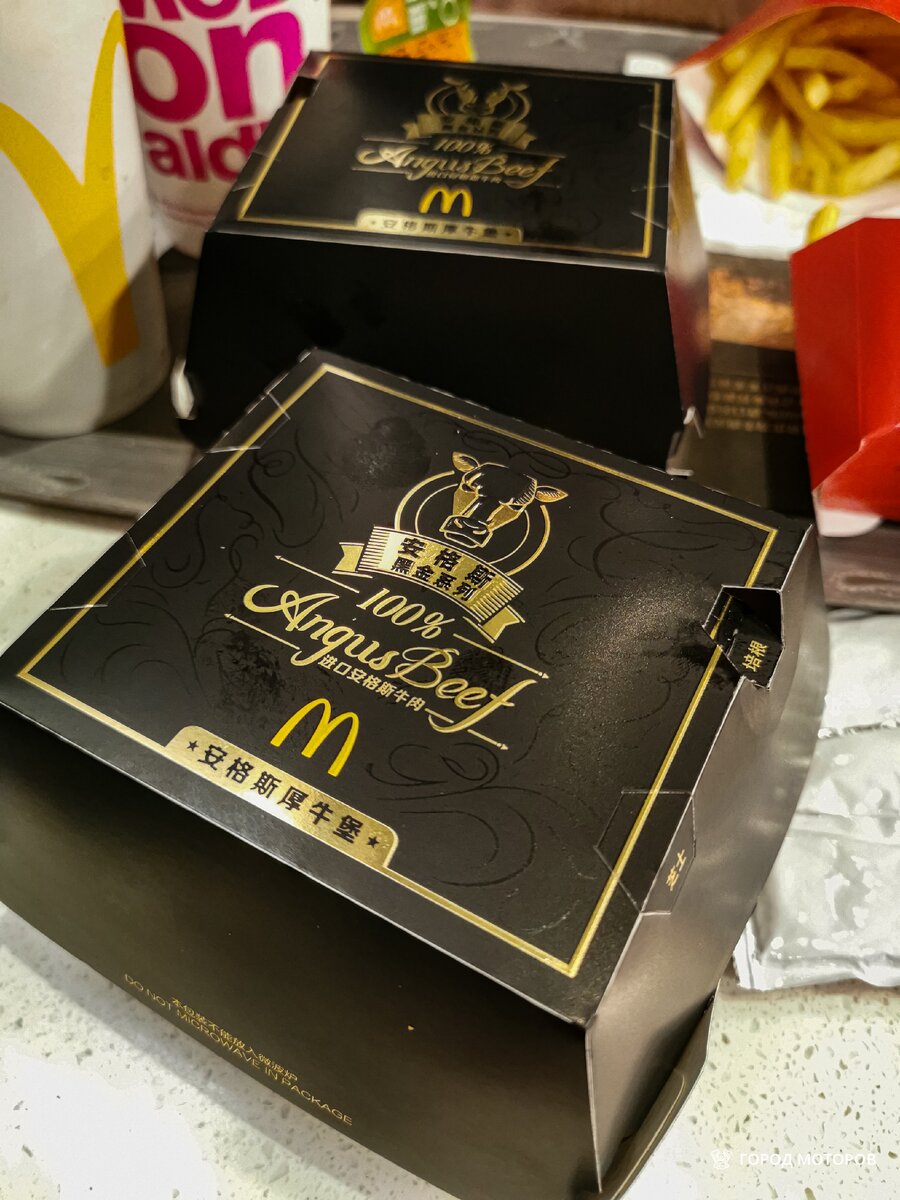 Посещение любой страны всегда связано с национальной кухней. И сейчас я говорю не только про чисто национальные блюда, но и про местные особенности сетевых ресторанов. Я всегда хотя бы один раз за время пребывания в любой стране захожу в McDonalds и беру там то, чего нет в российских ресторанах. На удивление Китай оказался не таким уж и особенным с точки зрения выбора бургеров в McDonalds, скорее американизированным. Тем не менее, там удалось попробовать бургер Angus Beef из говядины особой породы коров. Коробочка черного цвета с окантовкой под золото выглядит просто великолепно! Коровы породы Angus известны в России, как абердин-ангусские. Эта порода была выведена в XIX веке в Шотландии в горных районах с суровым климатом. Эта говядина отличается нежностью, сочностью и "мраморностью". По крайней мере так пишут в Википедии. Сам бургер впервые появился в США в 2006 году, а потом постепенно распространялся по разным странам. Вариантов бургеров, как обычно, несколько - один мы взяли на б