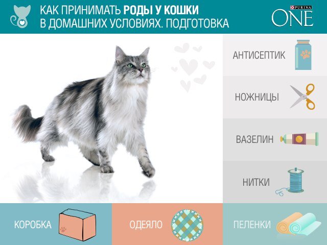 К моменту начала схваток, хозяева должны располагать полным арсеналом необходимых инструментов и средств, которые могут понадобиться во время родов. Передтем как принимать роды у кошки рекомендуется подготовить: