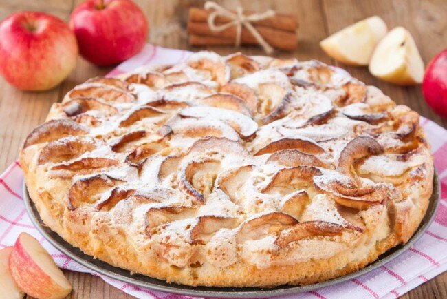 Для приготовления нам понадобится: 4 яйца 200 грамм сахара 140 грамм просеянной муки соль ванилин яблоки с корицей Для начала приготовим яблоки с корицей. 4 небольших яблока нарезать дольками. Поместить яблоки в миску и добавить корицу по вкусу. Тщательно перемешать и оставить на 10 минут. Пока яблоки с корицей настаиваются,мы приготовим тесто для нашей воздушной шарлотки. Отделяем белки от желтков . В миску с белками отправляем понемногу сахар и взбиваем до густой пены.Как проверить на готовность белковую смесь? При переворачивании миски смесь останется в неподвижном состоянии. Затем добавить по одному желтку и немного взбить миксером. Далее добавить просеянную муку и аккуратно помешивать лопаткой. По желанию можно добавить пару ложек какао для цвета,но естественный цвет шарлотки и так будет красивый. Далее форму для выпечки смазать маслом. Тесто вылить в форму и аккуратно разровнять. Далее выложить яблоки с корицей(ранее приготовленные) по форме. В разогретую духовку поставить тест