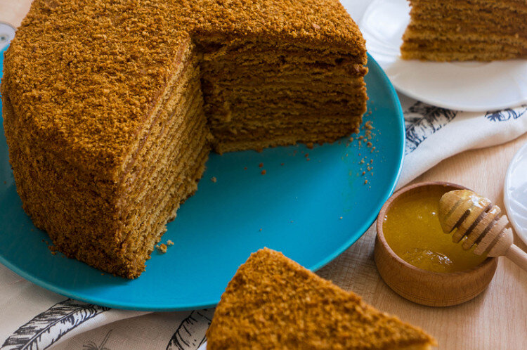 Для приготовления теста нам понадобится: 3 яйца 1 стакан сахара 2 столовой ложки мёда 1 столовую ложку водки 60 грамм сливочного масла 2 чайной ложки соды без горки Приготовление: Для начала сделаем паровую баню. В кастрюлю добавить 3 яйца,1 стакан сахара,2 столовой ложки мёда и 1 столовую ложку водки. Когда все соединится в однородную массу сразу же добавить 60 грамм сливочного масла и 2 чайной ложки соды без горки. Всю эту массу снять с паровой бани,добавить 3-4 стакана просеянной муки. Тесто раскатать в колбаску и разделить на 10 равных частей. Духовку включить на разогрев. каждую часть теста раскатать в круги диаметром 25 сантиметров. Каждый корж проткнуть вилкой для того чтобы он не поднимался. Выпекать каждый корж на протяжении 3-4 минут до появления золотистой корочки. Дать коржам остыть. Пока коржи остывают мы приготовим крем. Для крема нам понадобится: 1 яйцо половина стакана сахара 250 грамм мягкого сливочного масла сгущёнка по вкусу Приготовления крема: Яйцо взбить с с