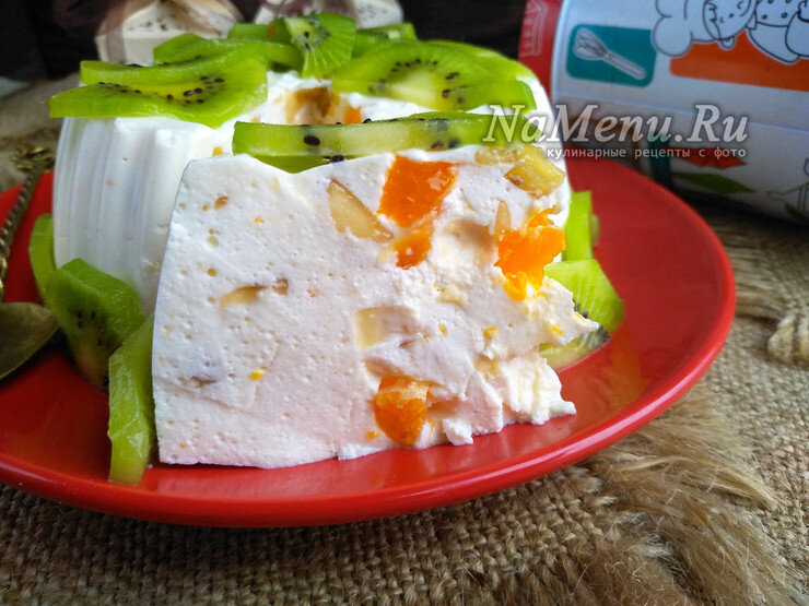 Творожный десерт с желатином и фруктами без выпечки со сметаной
