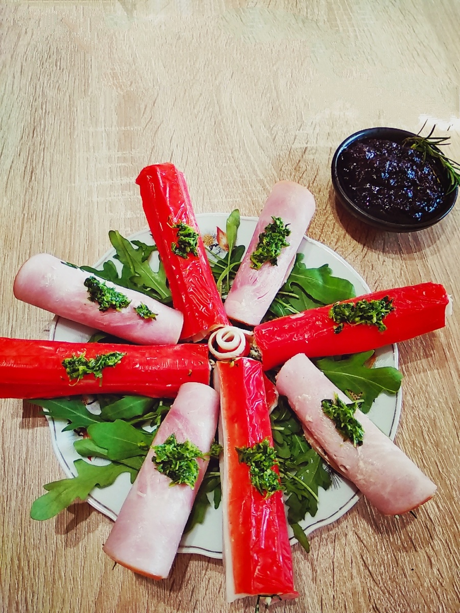 🍬 На ветчину кладём смесь и сворачиваем рулетики.