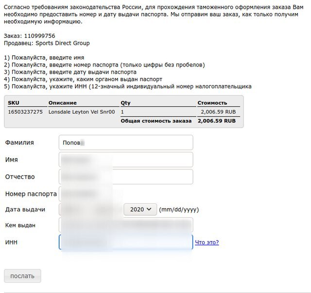 Поскольку доставка курьерская, то требуется предоставление паспортных данных и ИНН.