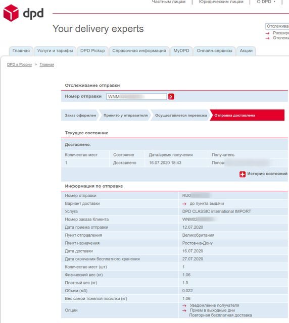 Заказ был сделан 5 июля 2020г, а в Ростове-на-Дону один из пакетов появился в пункте выдачи 15 июля, а второй - 16 июля. Вместо курьерской доставки выбрал пункт выдачи, чтобы не ждать курьера. При этом был сильно удивлён, что DPD может доставлять курьером после 18 вечера только за дополнительную плату.
