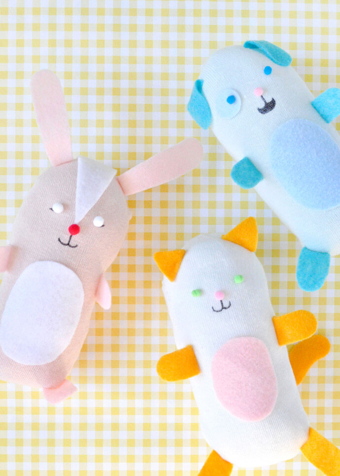 Предлагаем сделать милых тряпичных кукол из подручных средств! Цвет выбирайте сами, чем более необычными они будут, тем ярче и веселее получится поделка. Что вам понадобится: Как делать: 1. Набейте носок ватой, оставив пустой зону щиколотки. 2. Согните пустую зону щиколотки и приклейте к задней стороне носка. 3. Приклейте маленькие помпоны, чтобы получились глаза и нос. 4. Вырежьте из войлока треугольники (из них сделаем уши) и прямоугольники для лапок. Прямоугольники должны быть округлыми с одной из сторон. Также вам понадобится сделать большой овал для живота и сформировать хвост. 5. Приклейте все элементы на носок. Первый зверек готов! Теперь, следуя той же последовательности, можно сделать зайку и собачку!
