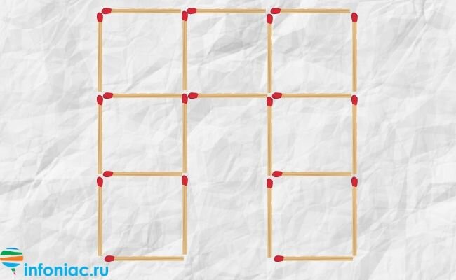 Вам предлагается взглянуть на картинку со спичками и придумать, как можно передвинуть две спички таким образом, чтобы образовать восемь квадратов.