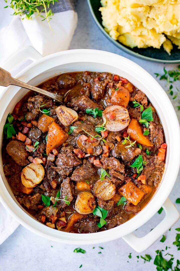 Для меня говядина по-бургундски остается одним из самых любимых праздничных блюд. Я традиционно готовлю его и подаю на новогодние праздники. Прелесть этого блюда еще и в том, что оно подходит абсолютно для любого гарнира: будь то запечённый картофель или пюре, овощи гриль или рис. Это нежное рагу со своим прекрасным соусом скрасит любой праздник, застолье или романтическое свидание.