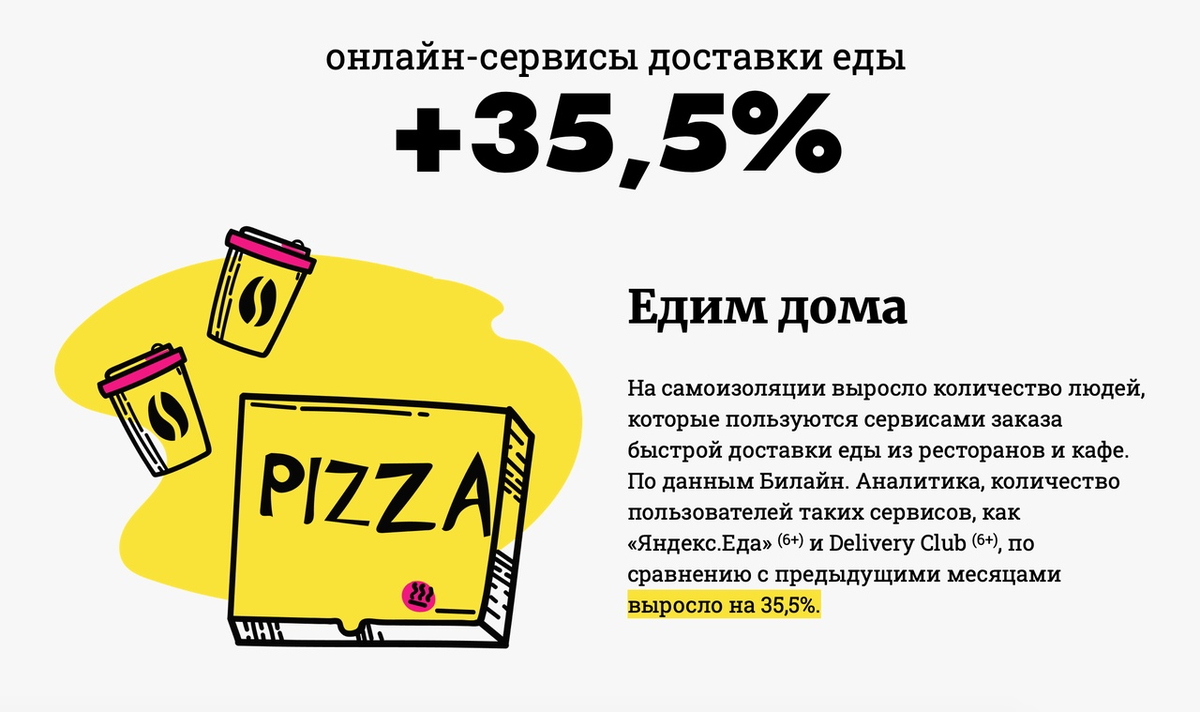 Большой отчет Билайн подтверждает теорию, что люди будут заказывать еду на дом, даже в условиях коронокризиса и финансовых трудностей.