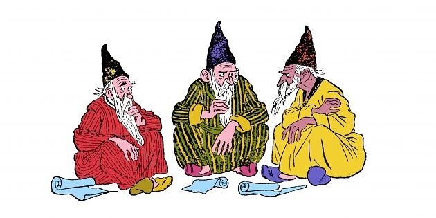Царь решил проверить своих троих мудрецов на мудрость, пригласил их и сказал: «Мудрецы, у меня есть 5 колпаков – 3 из них черные, а 2 белые. Сейчас вы закроете глаза, и я надену на ваши головы эти колпаки, при этом вы не будете знать, колпак какого цвета у вас на голове, но будете видеть колпаки других мудрецов». После осуществленных действий мудрецы открыли глаза и долго-долго молчали. Затем один из мудрецов произнес: «На моей голове черный колпак!» И он был прав. Вопрос: как мудрец догадался? Ответ: После того, как мудрецы открыли глаза, они долго-долго молчали, что является ключевой фразой, потому что если бы один из мудрецов увидел на двух других белые колпаки, то он бы сразу понял, что на нем черный колпак. Поэтому первый важный вывод: на головах мудрецов нет двух белых колпаков. Соответственно, есть либо один белый, либо вообще нет. Далее. Наши мудрецы: А, Б и В. Догадался о том, что на нем черный колпак мудрец А. Проследим ход его мыслей: «Предположим на мне белый колпак, тогда