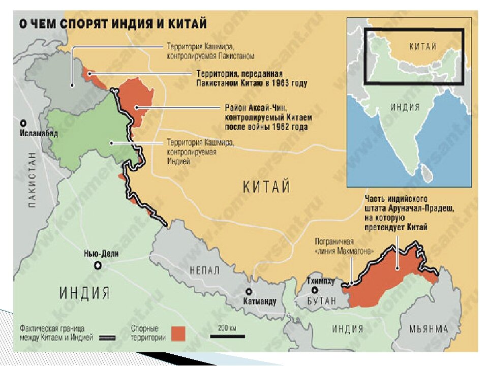 Уважаемые читатели, перед вами карта района конфликта. В чем причина военных столкновении между Великими странами. Давайте разберемся. Территория АКСАЙ ЧИН - это цепь ледников необитаемой соляной пустыни, принадлежит Китаю, после войны 1962 года. Индия претендует на это территорию. Это западная часть Гималая сегодня управляется Китаем. Восточная часть Гималаев находится под управлением Индии. Штат АРУНАЧАЛ ПРАДЕШ покрыт густыми лесами и Китай претендует на эту территорию. Дело в том что, Пакистан тоже подложил бомбу замедленного действия, в 1963 году передал Китаю свою небольшую территорию. Кругом одни горы и высокогорье. Нет ничего ценного, одни только амбиции и споры за горные хребты. Разве только чтобы построить военные базы, для нанесения ракетного удара Когда то, Англия давая независимость Индии, специально разделили территорию Индостана на различные государства