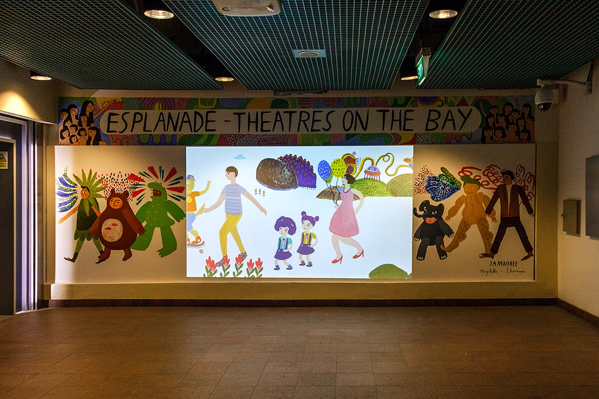 Немного заблудились в переходе, почти забрели в театр Эспланада. Хотя театр начинается уже в переходах. Здесь крутят бесконечный мультфильм, в котором все идут под музыку.