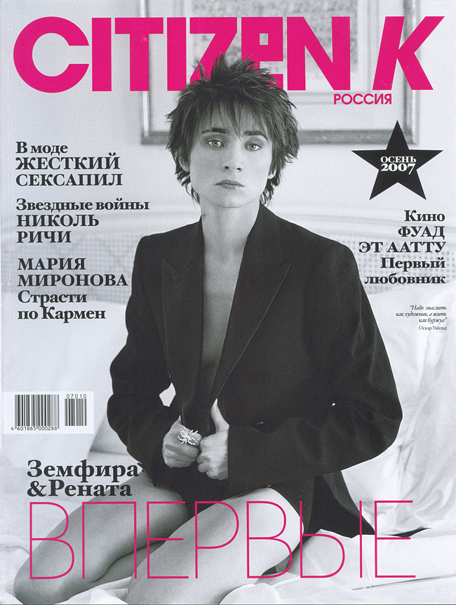 У культовой певица нулевых до сих пор есть преданные фанаты, один из них Глеб Серебряков на днях,желая привлечь внимание звезды, перебил все окна в ее дорогой иномарке. Фаната задержали и назначили ему судебно-психиатрическую экспертизу, в ходе которой выяснилось что мужчина неадекватен Обложка журнала Citizen. Земфира -гениальный исполнитель и автор собственных песен в стиле рок, известная с конца 90х годов по сей день. С 1999 года Земфира выпустила шесть студийных альбомов, получивших значительное внимание прессы и публики. В 2012, 2013 и 2014 годах певица вошла в рейтинг «Сто самых влиятельных женщин России», составленный информационными агентствами РИА Новости, «Интерфакс» Тексты песен Земфиры отличаются своеобразием и неповторимым стилем. Сама певица не любит рассказывать в интервью о текстах и не считает себя поэтом. По слухам Земфира много лет живет в фактическом браке с режиссером и актрисой Ренатой Литвиновой, но обе женщины данный факт никак не комментируют. А вы