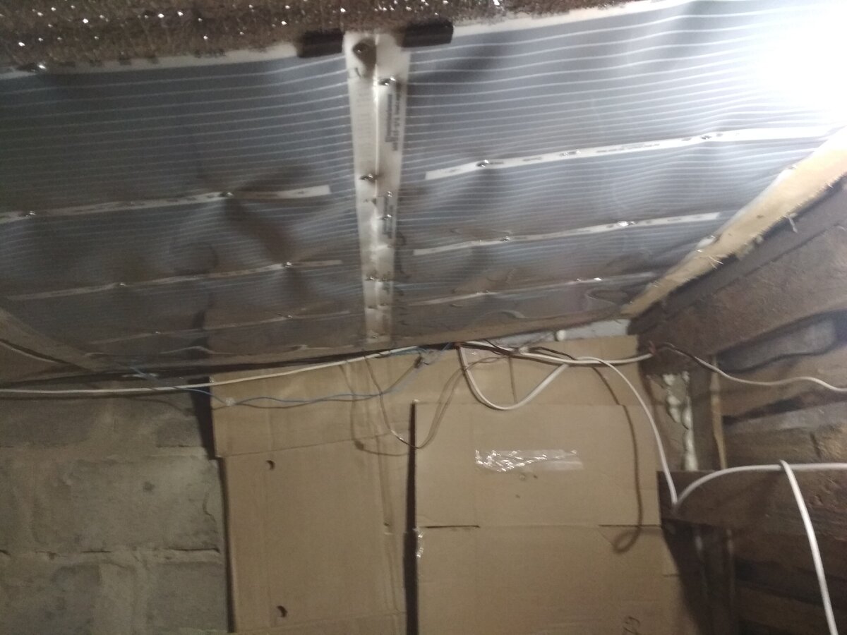 Курятник у меня размером 3×3м, не отапливаемый, сделан из обычных досок, обшит снаружи коврами, а внутри большой слой из картонных лотков (кассеты для яиц), спрятанный под картон. В общем, курятник был построен на "скорую руку". В него мы и заселили 20 кур. Пришла зима, и встал вопрос с отоплением. Я искал решение этой проблемы. Можно было просто поставить обогреватель, но щели и картон плохо удерживают тепло. Ещё одним вариантом были инфракрасные лампы, но так как они потребляют большое количество энергии, от этой идеи нам пришлось отказаться. В итоге было принято решение использовать в качестве обогрева инфракрасное излучения от "тёплого потолка". Для этого были приобретены тёплый потолок и специальный датчик температуры. Система в установки очень лёгкая. Я использовал утеплитель с отражающей поверхностью, который установил ровно на то место, куда в будущем крепил "тёплый потолок". На потолке две поверхности: на одной есть надписи, на другой - нет. Смысл в том, что устанавливать пан