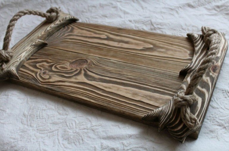 Если будет возможность, сначала их необходимо окрасить, но и в естественном облике поднос выглядит очень интересно. Главное, приделать рукояти для практичности.