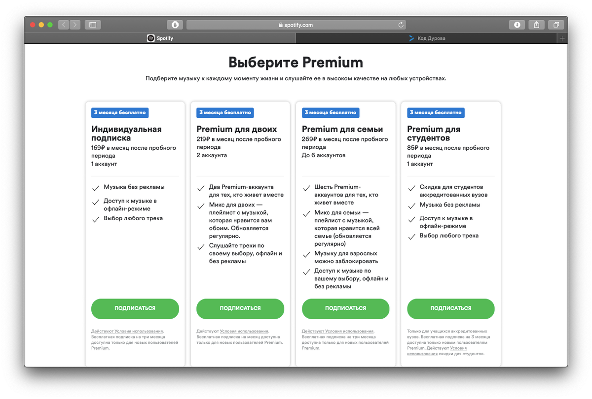 Начнем сразу с цен и тут все не так однозначно. Я уже около года использую BOOM и там в месяц приходится выкладывать по 149 рублей, Spotify предлагает просто грабительский тариф 169 рублей. И, казалось бы, переплата в 20 рублей это не так уж и много, но в год выходит 240 рублей. Однако первые 3 месяца сервис дарит бесплатно, а после этого можно зарегистрировать другой аккаунт, и получить еще 3 месяца (но я вам об этом не говорил).