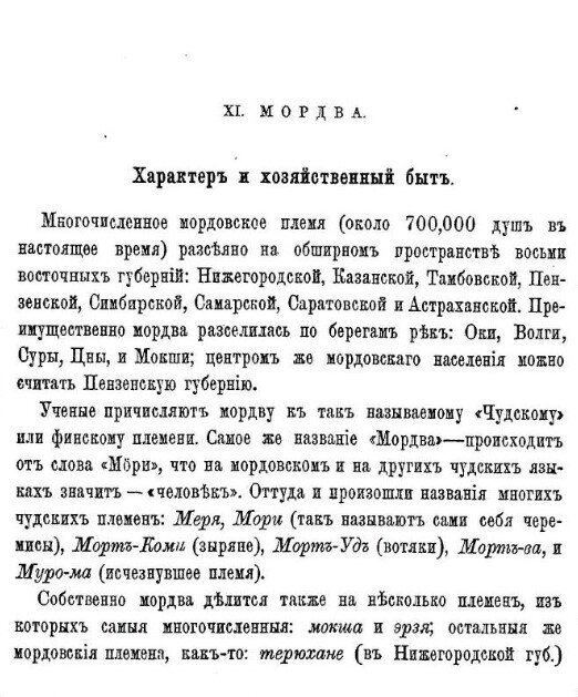 "Многочисленное мордовское племя(около 700000 душ в настоящее время) рассеяно на обширном пространстве восьми восточных губерний: Нижегородской, Казанской, Тамбовской, Пензенской, Симбирской, Самарской, Саратовской и Астраханской.