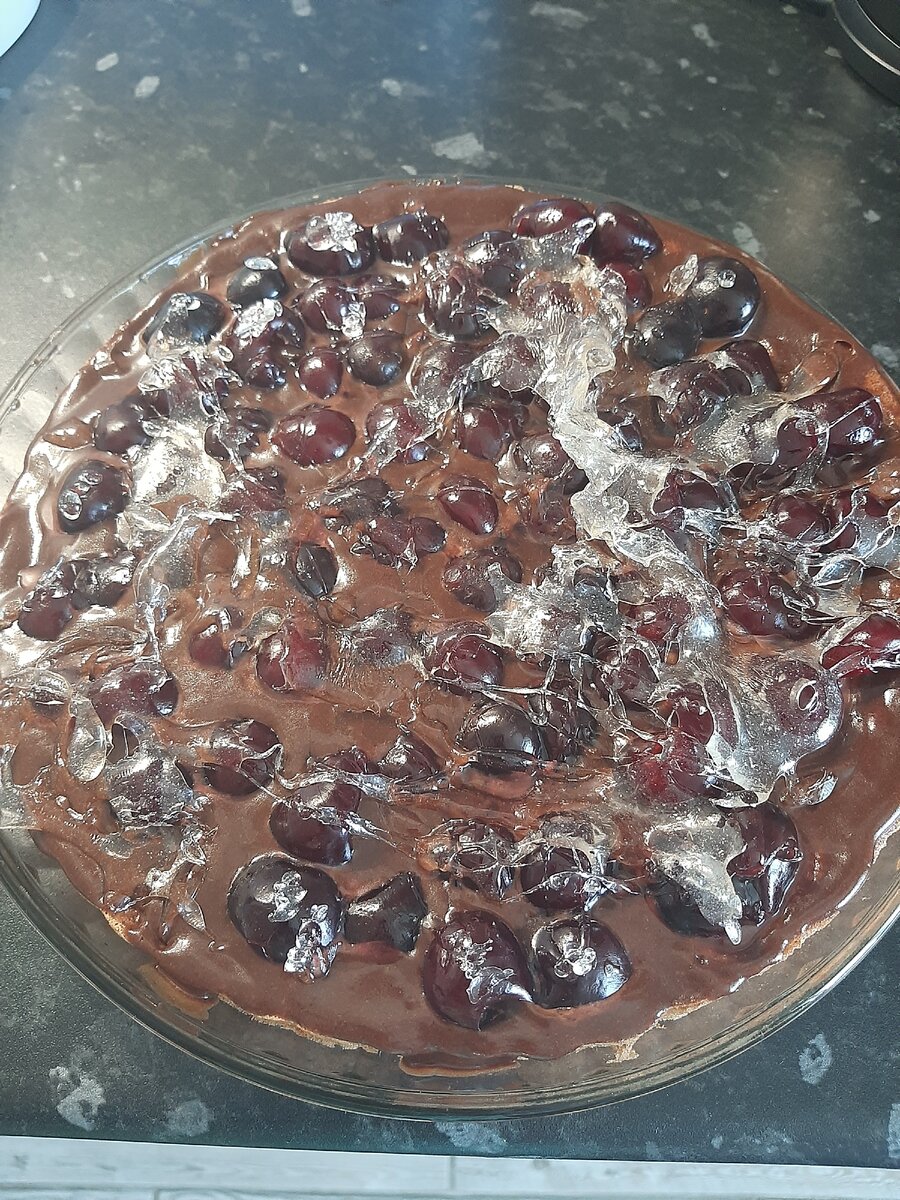 Этот десерт готовится в течении часа. Очень прост в приготовлении. ингредиенты: для теста- 2 яйца, 0,5 стакана сахара, 0,5 стакана муки 12 г разрыхлителя. для глазури- 4 столовые ложки с горкой сметаны 15%, 4 ст ложки какао порошка, 125г сахарного песка. 20г сливочного масла. 300г вишни. для карамели- 125 г сахарного песка. 50г воды. взбиваю миксером яйца с сахарным песком, пока масса не станет густой и не увеличится в два раза в объеме. добавляю муку с разрыхлителем, медленно перемешивая массу до однородности и затем выливаю в форму, смазанную маслом, отодвигая немного тесто к бортикам, чтобы при выпикании середина не поднялась "горкой". ставлю в духовку 170 градусов на 20 минут. Диаметр формы у меня 28 см В это время, пока выпекается тесто делаю глазурь. Сметанусмешиваю с сахаром и какао порошком на среднем огне. как только смесь станет однородной и блестяшей как шоколад снимаю с огня и добавляю масло. отделяю от вишни косточки. в это время корж испекся. когда он остынет поливаю гла