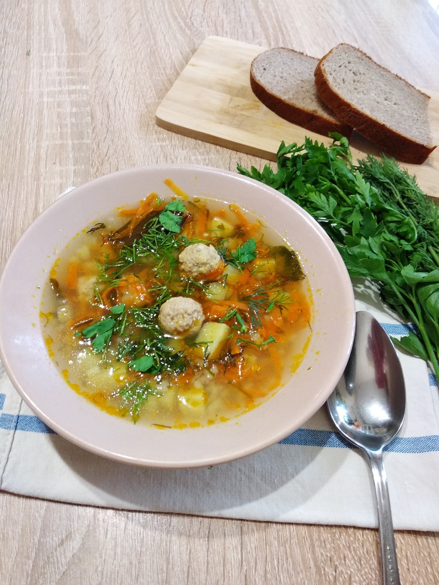 Суп с фрикадельками – любимое блюдо из детства, не нужно тратит много времени для его приготовления, а вкус получается отменным, яркий и насыщенный. Существует масса рецептов этого популярного супчика, ну а я приготовила его с рисом. Ингредиенты: 🍥Вода - 4,5литра 🍥 Картофель - 3 шт 🍥 Морковь - 1 шт 🍥Лук - 1головка 🍥 Рис ( у меня смесь для харчо) - 100 гр. 🍥Фарш - 500 гр. 🍥 Петрушка - 100 гр. Начинаем готовить: 🍬 Воду ставим на плиту и доведим докипения, уменьшаем огонь. 🍬 Картофель чистим, режем кубиками и опускаем в кипящую воду. После того как опять закипит, снимаем образовавшуюся пену, как правило это крахмал от картофеля. Даём провариться 5 минут. 🍬 Засыпаем промытый рис, в моем случае смесь для харчо. 🍬 Лук, морковь чистим, режем, пассеруем на растительном масле. Добавляем в наш суп. 🍬 Из фарша скатываем шарики величиной с грецкий орех. 🍬 Фрикадельки кладем в кастрюлю и варим 15 минут. 🍬 В суп добавляем лавровый лист, солим, перчим по вкусу. Провариваем 5 минут.