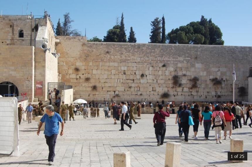 Небольшой участок, отведенный для молитв и обрядовых действий иудеев, более известен под названием “Стены Плача”. Явно многократно достраивалась. Блоки верхнего яруса закрывают какую-то дыру огромного размера, проделанную в ходе давнего разрушения. Блоки нижнего видимого яруса состыкованы идеально – щели нулевые в отличие от верхнего яруса и от поврежденных мест, куда вставляются записки.