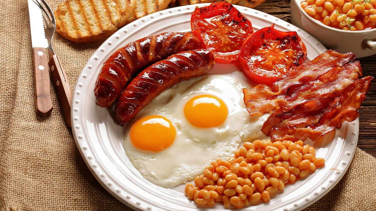 - На большую тарелку выложить яичницу. Извлечь из духовки сосиски и положить их на эту же тарелку. Туда же отправить помидор, фасоль, шампиньоны, бекон, кровяную колбасу и ломтик-другой белого хлеба. Налить на тарелку коричневого соуса и подавать. В качестве напитка к такому завтраку, кажется, подходит только эль или портер. По крайней мере во времена королевы Виктории, когда сложился этот канон, утром пили именно их.