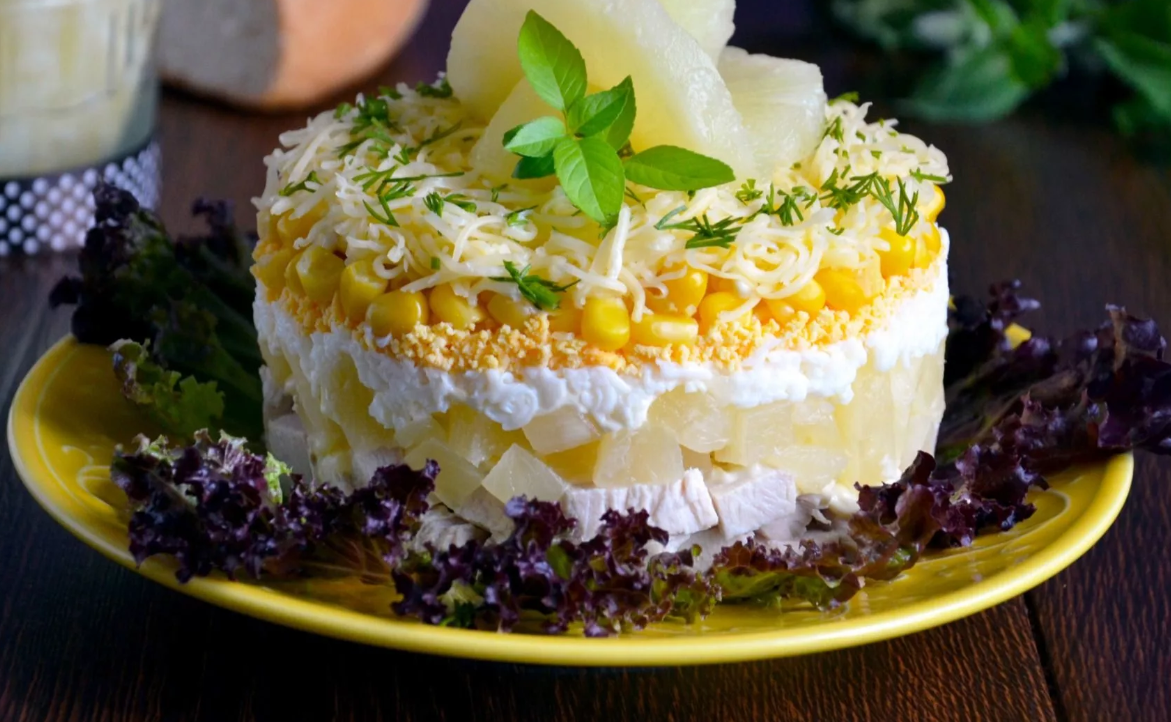 Рецепт салата с консервированными ананасами и кукурузой.