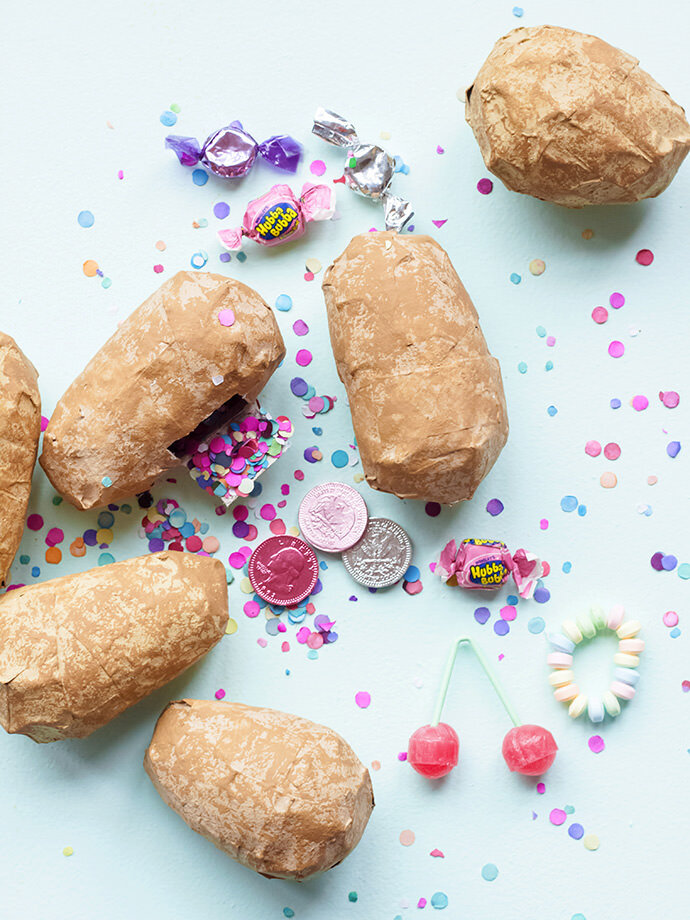 Игра «горячая картошка» известна всем от мала до велика! Давайте сделаем горячие картофелины, ими интересно играть. После игры в «картошках» можно сделать отверстия и хранить сладости. Что вам понадобится: Как делать: 1. Надуйте несколько шариков. 2. Смешайте муку с водой. Окуните в смесь газету и двумя пальцами отожмите излишки. Нанесите газетные полоски на воздушный шарик. Мы рекомендуем наносить по 2 слоя газеты на шарик. После того, как нанесете слой, оставьте шарик высыхать. 3. Покрасьте получившуюся поделку в белый цвет и оставьте сохнуть. 4. Затем, покрасьте ее в коричневый цвет. После этого снова понадобится сушка. 5. Выдавите краску более темного коричневого цвета на лист вощеной бумаги. Окуните мочалку в краску и удалите излишки. Оставляйте мочалкой пятна по всему картофелю, пока он не станет пятнистым. Оставьте сохнуть. 6. На обратной стороне картофелины вырежьте прямоугольное отверстие, вытащите остатки шарика. В это отверстие вы можете класть сладости. Если отверсти