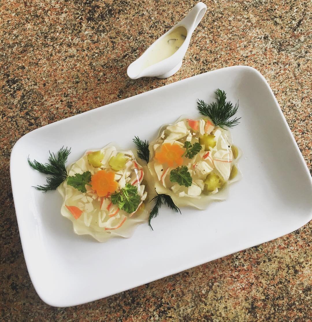 Крабы заливные. Ингредиенты. 200 г хрена с уксусом 400 г рыбного желе 50 г зелени петрушки или укропа 250 г консервированных или варёных крабов 50 г зелёного салата 100 г варёной моркови 100 г свежих огурцов 100 г консервированного зелёного горошка 100 г отварного картофеля. Способ приготовления Для приготовления крабов заливных в формы для порционных заливных блюд влить немного горячего рыбного желе (см. рецепт «Желе на основе рыбного бульона»). Когда желе застынет, положить сверху на него кусочки крабов (крабы варятся после закипания 10-20 минут), варёные картофель и морковь, а также свежие огурцы, нарезанные мелкими кубиками, и горошек, а затем залить всё незастывшим (но не горячим!) желе и поставить в холодное место. Перед подачей форму опустить на несколько секунд в тёплую воду, встряхнуть, чтобы желе отстало от стенок формы, выложить на блюдо и гарнировать овощами (горошком и морковью). Сверху крабов заливных украсить зеленью и листьями салата. Отдельно в соуснике пода