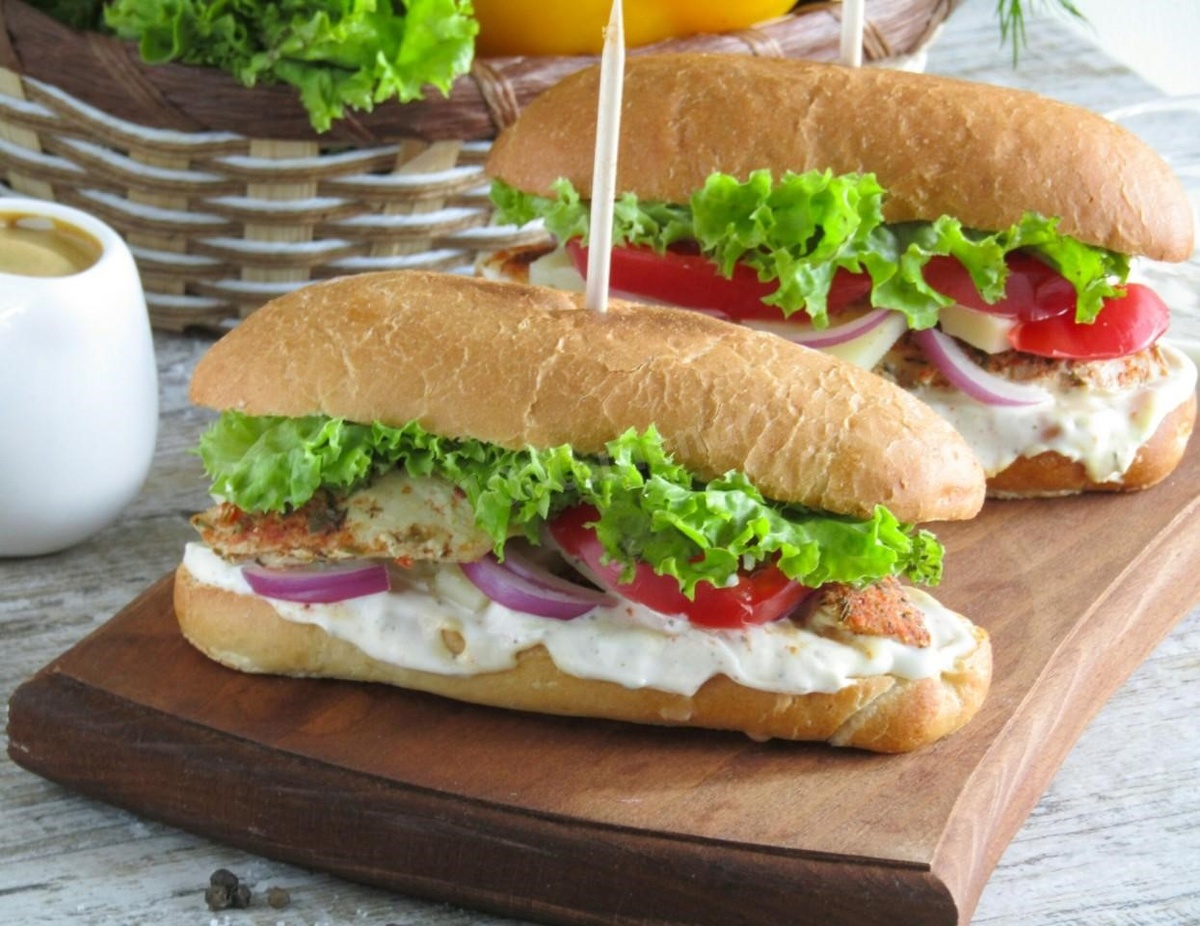 Ингредиенты: Шаг 1: Приготовьте соус. Майонез смешайте с горчицей, можно добавить специи, например паприку, сушеные томаты, хмели-сунели, чёрный молотый перец, прованские травы, а можете не добавлять - это дело вкуса. Можно измельчить зелень и чеснок и добавить в соус, также по вкусу. Шаг 2: Листья салата промойте и хорошо просушите. Шаг 3: Булочки разрежьте пополам вдоль и прогрейте с двух сторон на сковороде гриль или на обычной сковороде до румяности, масло добавлять не нужно. Можно воспользоваться тостером. Шаг 4: Смажьте нижние половинки булочек соусом. Шаг 5: Куриное филе приготовьте любым способом. Можно отварить, запечь или обжарить. Шаг 6: Помидоры и сыр нарежьте тонкими ломтиками и выложите поверх филе. Помидоры для сэндвичей лучше выбирать не водянистые. Шаг 7: Поверх помидора выложите листья салата и накройте второй частью булочки, можно закрепить деревянными спажками, чтобы сэндвич не разваливался и его удобно было кушать . Приятного аппетита!:))) Источ