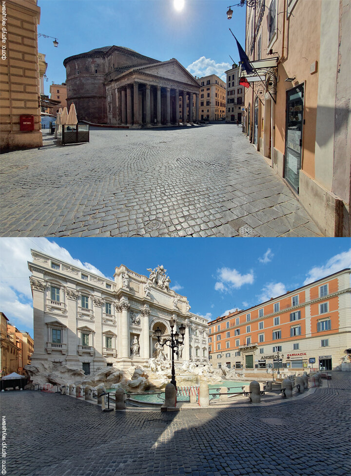 В тяжбе с вирусом настал позиционный период. Мы, как известно, выходили на плато. В Риме тоже не сидели по норам, хотя для любого выхода на улицу требовалось распечатать бумажный пропуск. Но велосипедные прогулки не запрещены? И Артур совершает кавалерийский, то есть велосипедный, набег на достопримечательности под карантином. Фонтан Треви, Колизей, Испанская лестница, Ватикан — залитые весенним солнцем. И ни души (см. фото). Первый фоторепортаж римской пандемической эры вызвал в сетях шок и ярость: гида требовали осудить, наказать. За легкомысленные виды в эту суровую годину. За искушение недоступной красотой. За успокоительные просветы вопреки положенному перехмуру.