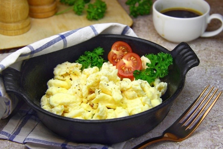 Ингредиенты: Шаг 1: Для приготовления классического скрэмбла понадобятся: яйца, молоко и сливочное масло, всё комнатной температуры (за 20 минут до начала приготовления достаньте их из холодильника). А также соль и молотый перец. Свежесть яиц нужно заранее проверить, поочередно опустив их в стакан с питьевой водой. Если яйцо всплыло - оно не свежее. Подходящее яйцо должно лежать горизонтально на дне. Шаг 2: Яйца вымойте под проточной водой и вбейте их в миску. Перемешайте вилкой до соединения белка с желтком. Пузыри тут ни к чему, нужна просто однородность массы. Влейте молоко и добавьте соль. Снова перемешайте смесь до однородности. Шаг 3: Небольшую сковороду с антипригарным покрытием разогрейте на среднем огне. Растопите сливочное масло. В классическом рецепте скрэмбл жарят именно на сливочном масле, а не на подсолнечном. Сливочное масло значительно обогатит вкус готового блюда. Шаг 4: Перелейте яичную смесь на сковороду и подождите двадцать секунд, пока яйцо только-только