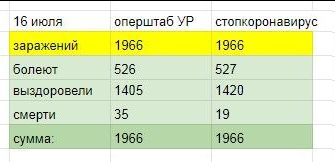 Просматривая текущие сводки по коронавирусу в Удмуртии я заметил несоответствие по числу летальных случаев. По сайту стопкоронавирус.рф 19 смертей за все время, по данным местного опрештаба 35. Можно ли списать это на разные методики подсчета или бардак? Думаю можно было бы, но определенный порядок в статистике есть: Первое. Все данные по количеству новых случаев от оперштаба спустя день попадают, как актуальные, на сайт стопкоронавирус.рф. Второе. В обоих случаях число болеющих, умерших и выздоровевших равняется числу зафиксированных случаев. На скрине ниже покажу данные по 16 июля для местных сводок, которые соответствуют 17 июля для федеральных данных. Разница в 16 смертей компенсируется для федеральной статистики большим числом выздоровлений и большим числом болеющих в данный момент. Несколько дней я отслеживаю оба источника и прихожу к такому выводу: число выявленных случаев ковид-19 в день и нарастающим итогом всегда совпадает, правда федеральные данные на сутки отстают. Число в