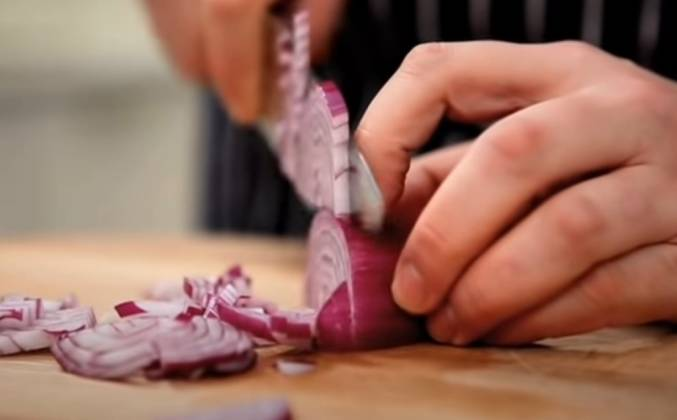 Надрезаем вот так и режем пополам сквозь основание. Теперь откладываем нож и снимаем верхний слой луковицы. Вот так. Теперь, сколько луковиц вы бы не резали приведите их все к такому виду прежде чем продолжать. Далее мы кладём луковицу основанием от себя. А с другого конца берём нож и надрезаем но не полностью сквозь луковицу. Видите, как поставлен нож? Он не вот здесь. Вы не отрезаете куски. Я не режу луковицу до основания.