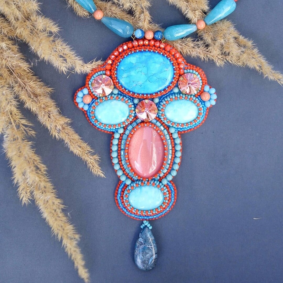 "Кулон выполнен в технике "вышивка бисером". Камни сперва приклеены, затем обшиты бисером так, чтобы он не вывалился. Все остальные элементы так же пришиваются",- написала читательница Ольга о своем изделии.