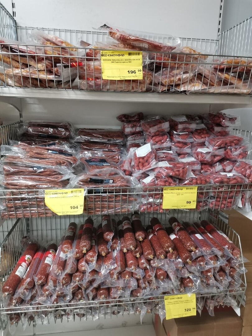 Нижний ряд - это обычная сырокопченая колбаса. Я когда-то занудствовала и говорила, что хорошая "сырокопченка" не может так стоить, но потом последила за ценами в супер/гипермаркетах, где по акции цена чуть-чуть выше и поняла, что дело просто в большой наценке. Я покупала колбасу с идеальным составом категории "А" за 400-450 рублей/кг, поэтому у меня уже почти нет вопросов к низким ценам в "Светофоре".