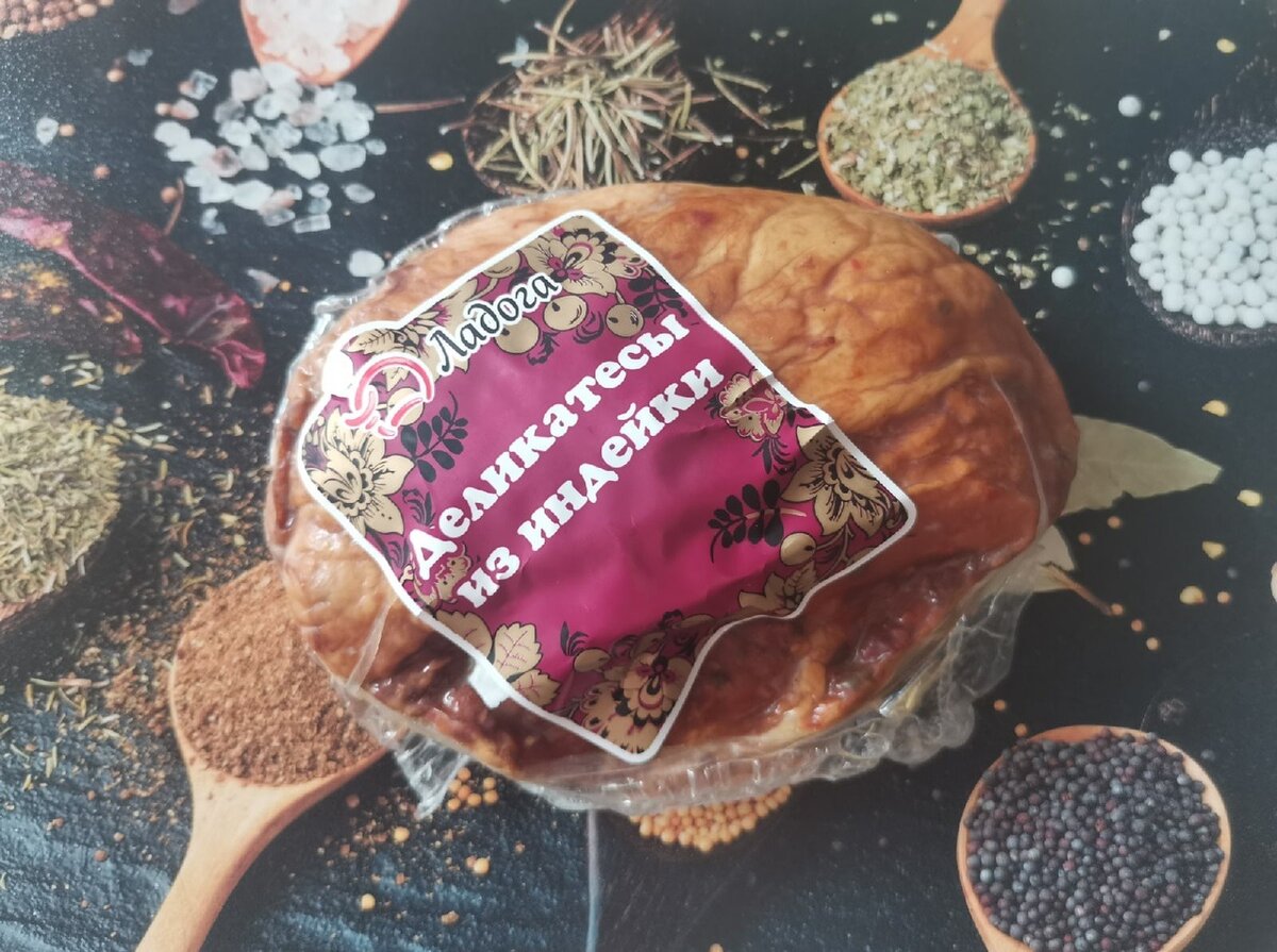 А сейчас я не просто поехала ради покупки деликатеса, а еще и для того, чтобы найти одного конкретного производителя, о котором мне так много и так часто рассказывали - "Ладога". Я и в самом магазине успела поговорить с женщиной, которая часто покупает продукты в "Светофоре", так на вопрос о том, чтобы она советовала попробовать из мясной продукции, мне вручили вот такой деликатес из индейки.