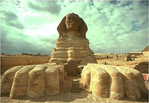 В Египте, на краю пустыни, воздвигнута грандиозная скульптура из всех, когда-либо созданных человеком. Это гигантский Сфинкс. Размеры его поражают: высота более двадцати, длина — 57 метров. Легенда повествует, что этот громадный хищник вечно бодрствует, охраняя покой пирамид, и с помощью «третьего глаза» следит за восходом солнца и обращением планет. Порукой его силы является Космос. С давних пор учёные полагали, что Сфинкс — современник пирамид. Но вот что странно — в древних папирусах, относящихся к эпохе постройки великих пирамид, о нём нет ни слова. Иероглифы донесли до нас имена строителей пирамид, архитекторв, создавших посмертные храмы фараонов, но авторы Сфинкса неизвестны. Он вообще не упоминается в документах, относящихся к тому времени.