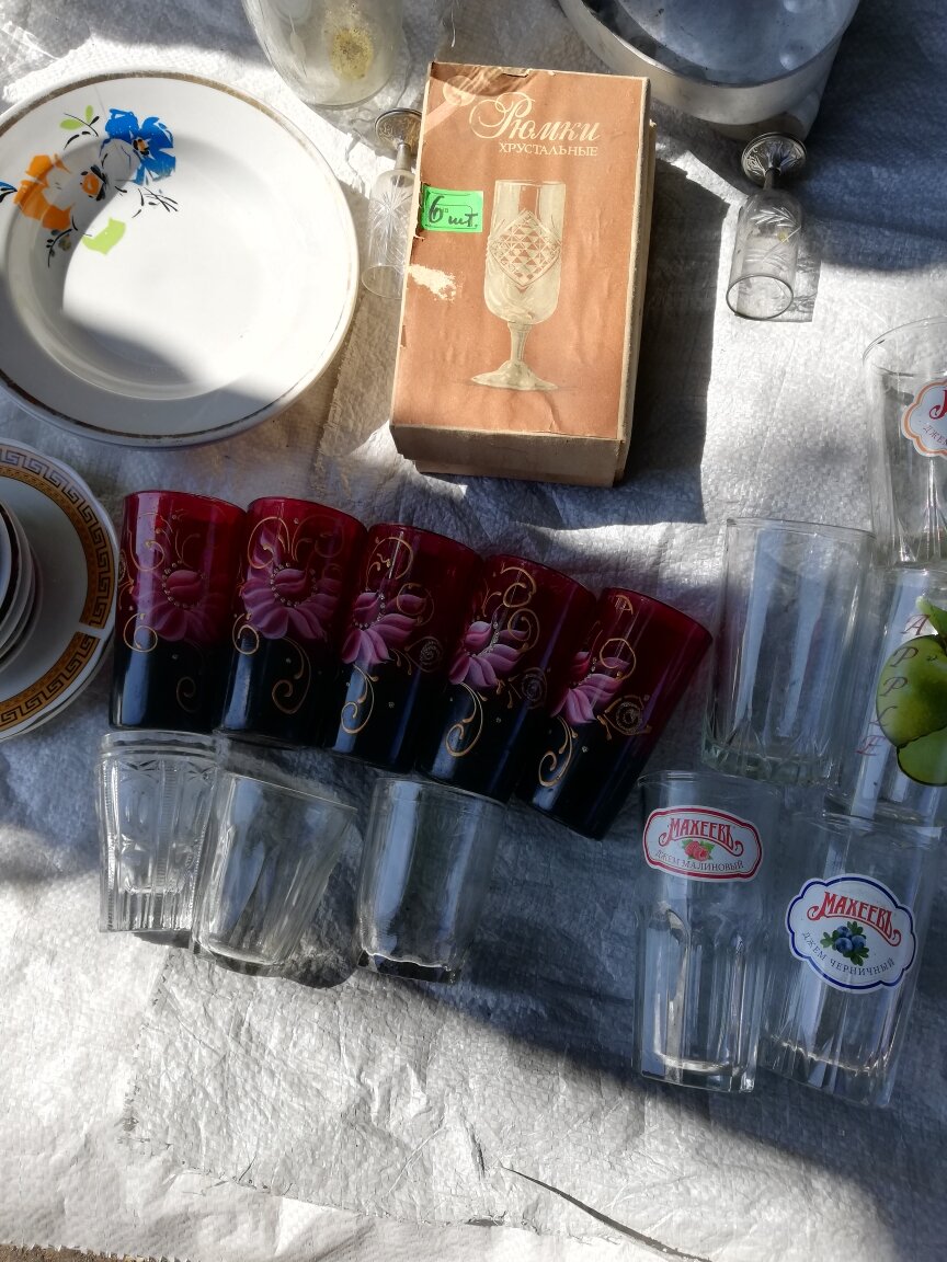 Начинаю свой променад, иду моим обычным путём. Попадается кукла Милана фабрики Весна, в непонятном тряпье и состоянии, ценник на куклу 800 рублей (жаль, что забыла сфотографировать). Дальше меня ждал небольшой сюрприз, я встретила набор из хрустальных стопок на мельхиоровой ножке из шести штук в оригинальной упаковке.