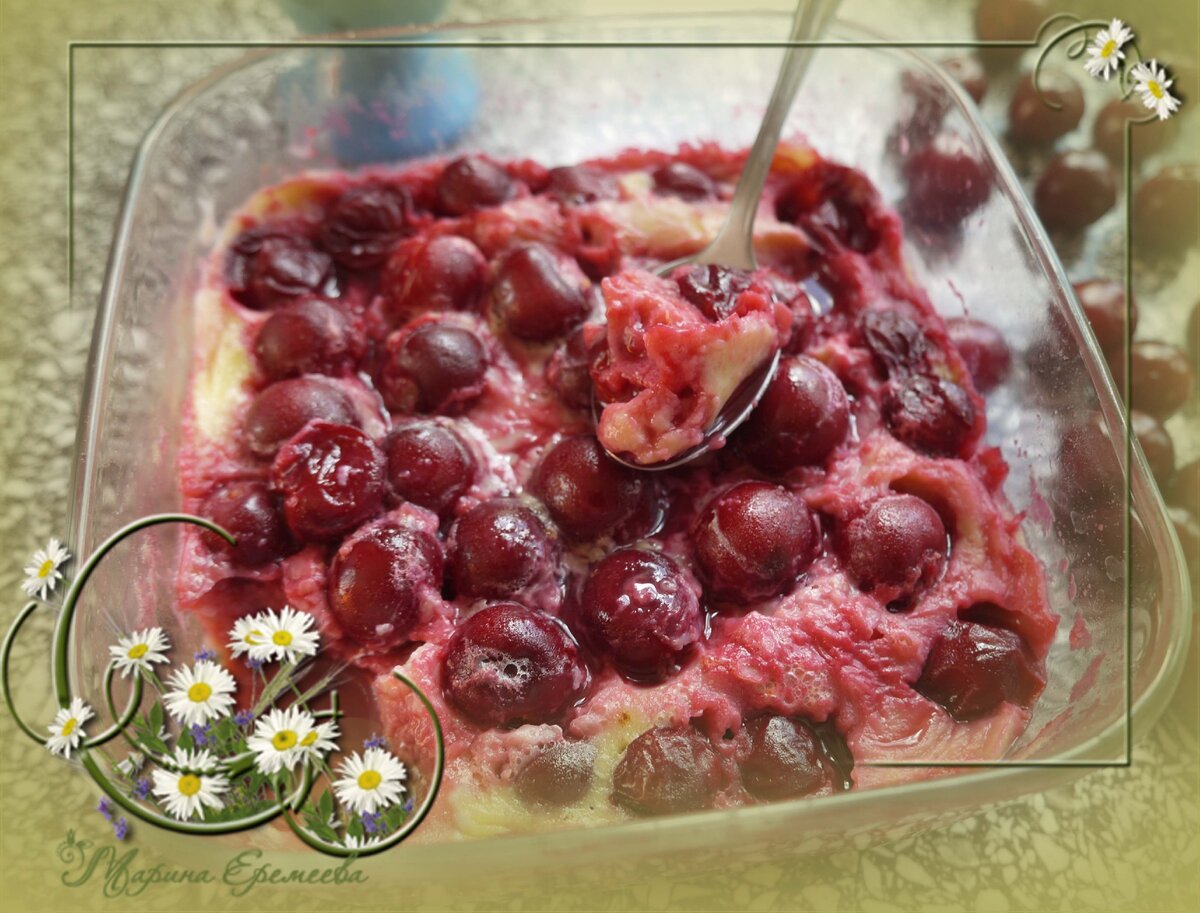 Ой, как люблю эти лёгкие десерты! Такие, чтобы было просто приготовить, и чтобы потом не жалеть о съеденном. Недавно попробовала один французский десерт с вишней, который называется клафути. Причём он готовится из вишни с косточкой. Вот уж не ожидала от себя, что мне это может понравиться. Потом готовила и без косточки и всё равно пришла к выводу, что с косточкой лучше. Знаете чем? Это какое-то особое удовольствие, когда вылавливаешь целую вишенку из нежного крема и неспешно отправляешь в рот. Это не еда, это наслаждение вкусом. Его можно готовить в духовке или микроволновке. Приготовление в духовке занимает примерно 20-25 минут. В микроволновке 4 минуты. Подготовка примерно 1-2 минуты. 1. Вишню моем и даём воде стечь. Выкладываем в форму. 2. В отдельной мисочке смешиваем молоко, яйцо, одну столовую ложку муки и одну столовую ложку сахара. Добавляем немного ванилина. Удобнее воспользоваться венчиком, должна получиться гладкая без комочков консистенция. Если вам покажется, что заливка