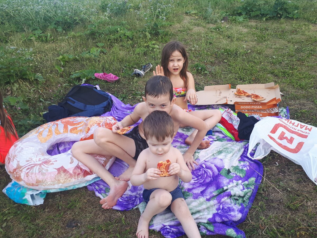 Всем привет. Сегодня как всегда жарко. Вчера, позавчера было +36° и немного дождь. Вчера даже гроза утром была. Но днем снова стало адски жарко 🙄 Я люблю когда +28°, так жарко как сейчас, это невыносимо. Мы хорошо отдохнули! Они повеселились, я посидела с Лорой на берегу и почитала книгу. Я очень хочу в свободное время по печатать на Дзен на телефоне, но не могу сосредоточится 😯 У меня получается писать, только с ноутбука, пока не понимаю в чем дело. Меня постоянно всё отвлекает, нет настроя, если я сажусь за телефон. Так, вот... Мы тащимся к речке: Мы притащились уже искупались и конечно нам захотелось кушать... Ходила я сегодня только с 6 самыми младшими, старшие 2 гуляли с подружками, и с нами идти не захотели. Поэтому остались без пиццы 😋 Отдохнуть отдохнули, покупались... И пошли домой 😁 По дороге домой у меня бомбануло)) Мы все устали... Я шла с Лорой на руках. Самые младшие, не хотели слушаться и отбегали далеко. Мне постоянно приходилось останавливаться и окликать их, жд